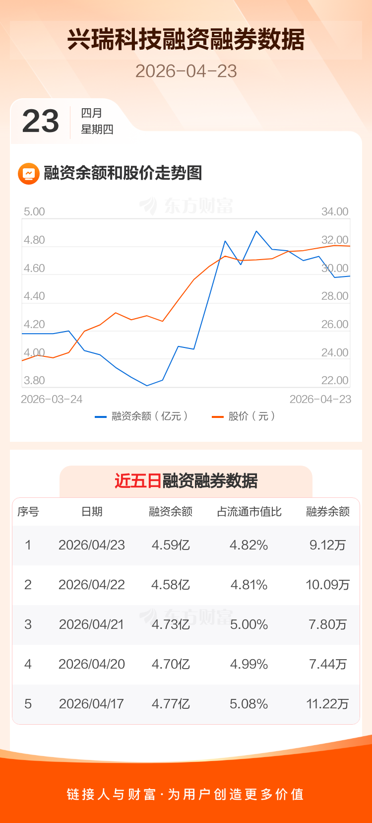 交易所最新数据显示,兴瑞科技于2026年4月23日获融资买入4747.77万元,融资偿还4692.60万元,当日融资净买入55.16万元。目前,该股融资余额4.59亿,占流通市值比例为4.82%。