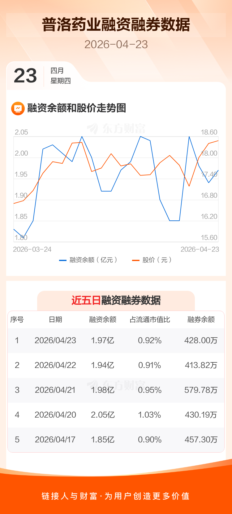 交易所最新数据显示,普洛药业于2026年4月23日获融资买入1858.18万元,融资偿还1564.16万元,当日融资净买入294.02万元。目前,该股融资余额1.97亿,占流通市值比例为0.92%。