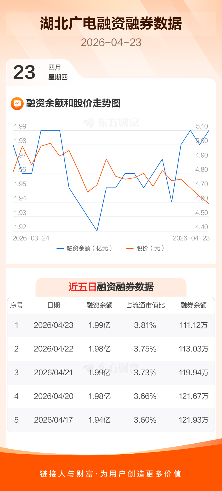交易所最新数据显示,湖北广电于2026年4月23日获融资买入582.95万元,融资偿还450.28万元,当日融资净买入132.67万元。目前,该股融资余额1.99亿,占流通市值比例为3.81%。