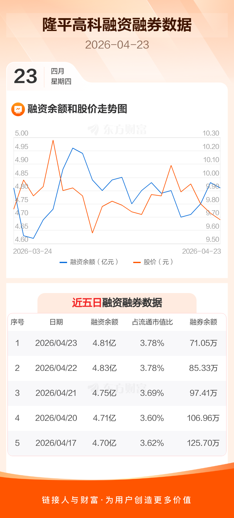 交易所最新数据显示,隆平高科于2026年4月23日获融资买入1978.56万元,融资偿还2155.70万元,当日融资净偿还177.14万元。目前,该股融资余额4.81亿,占流通市值比例为3.78%。