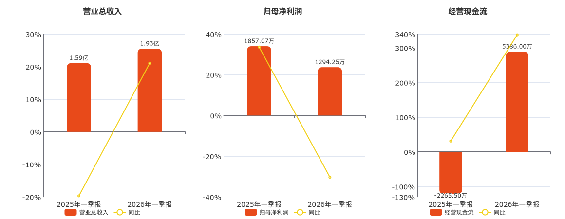 公司营业总收入为1.93亿元。归母净利润为1294.25万元,较去年同报告期归母净利润减少562.81万元,同比较去年同期下降30.31%。经营活动现金净流入为5386.00万元。