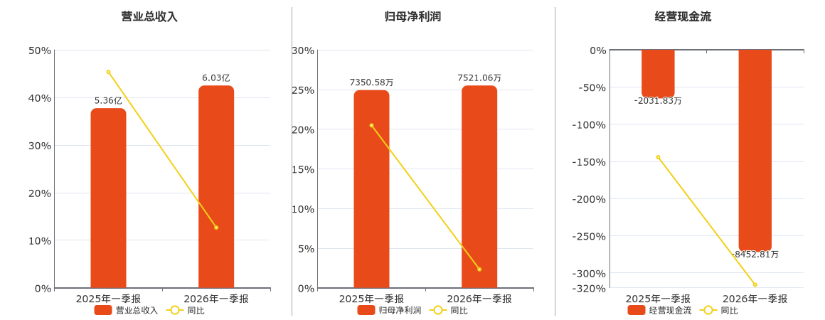 公司营业总收入为6.03亿元。归母净利润为7521.06万元。经营活动现金净流入为-8452.81万元,较去年同报告期经营活动现金净流入减少6420.98万元。