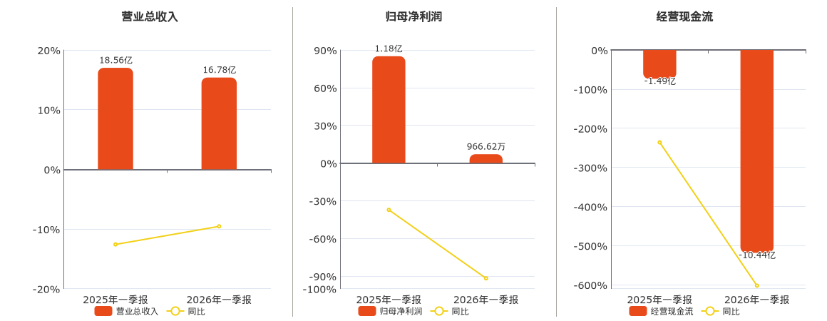 公司营业总收入为16.78亿元,较去年同报告期营业总收入减少1.77亿元,同比较去年同期下降9.56%。归母净利润为966.62万元,较去年同报告期归母净利润减少1.08亿元,同比较去年同期下降91.79%。经营活动现金净流入为-10.44亿元,较去年同报告期经营活动现金净流入减少8.95亿元。