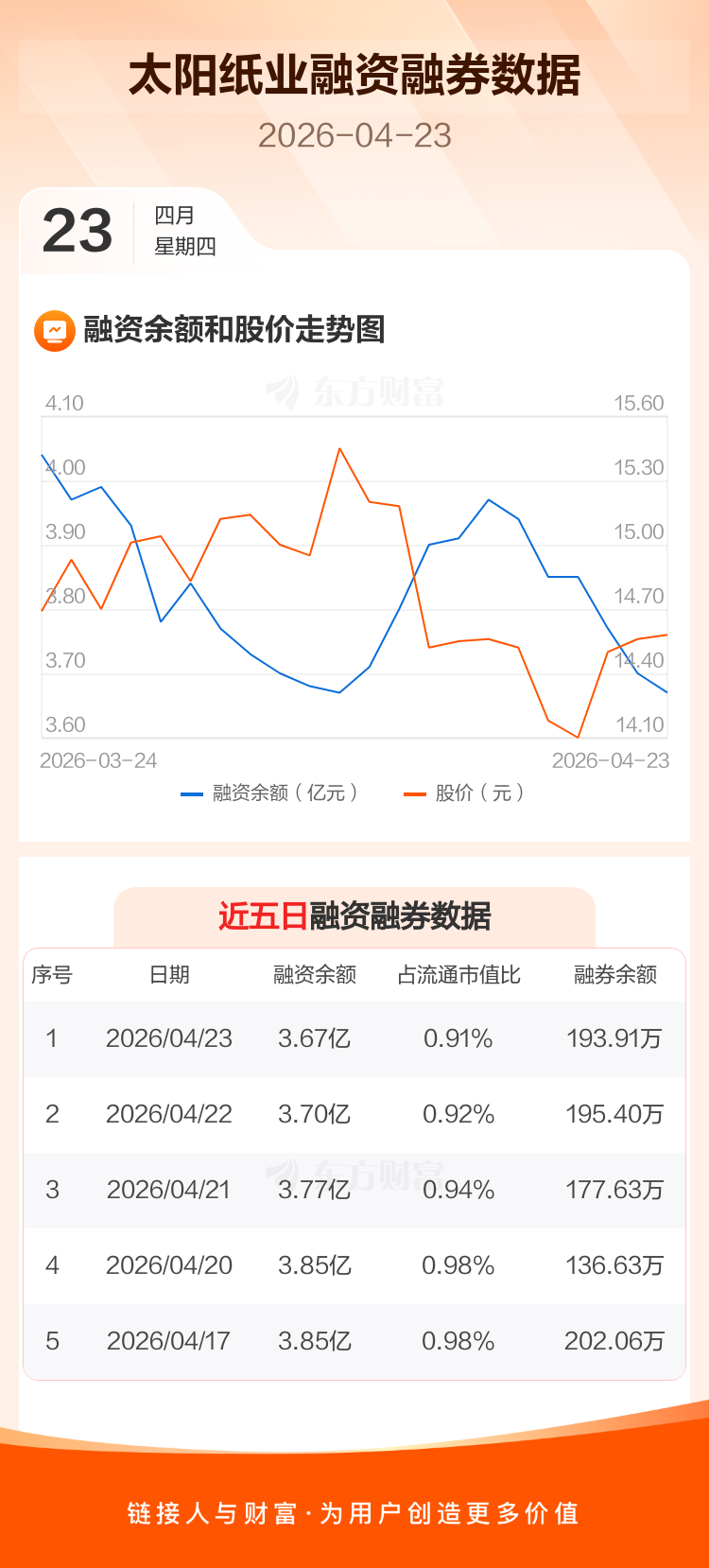 交易所最新数据显示,太阳纸业于2026年4月23日获融资买入918.45万元,融资偿还1209.75万元,当日融资净偿还291.3万元。目前,该股融资余额3.67亿,占流通市值比例为0.91%。