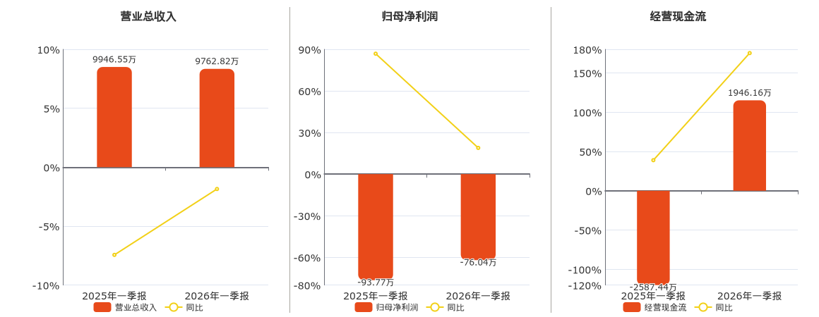 公司营业总收入为9762.82万元,较去年同报告期营业总收入减少183.73万元,同比较去年同期下降1.85%。归母净利润为-76.04万元。经营活动现金净流入为1946.16万元。