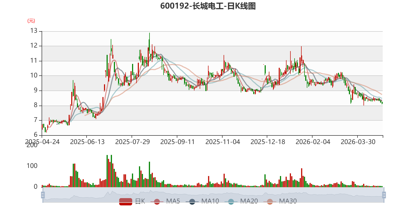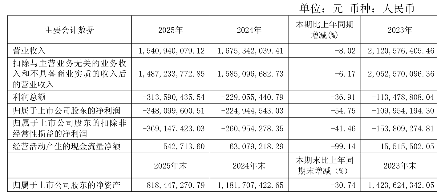 中证智能财讯长城电工(600192)4月24日披露2025年年度报告。2025年,公司实现营业总收入15.41亿元,同比下降8.02%;归母净利润亏损3.48亿元,上年同期亏损2.25亿元;扣非净利润亏损3.69亿元,上年同期亏损2.61亿元;经营活动产生的现金流量净额为54.27万元,同比下降99.14%;报告期内,长城电工基本每股收益为-0.788元,加权平均净资产收益率为-34.81%。