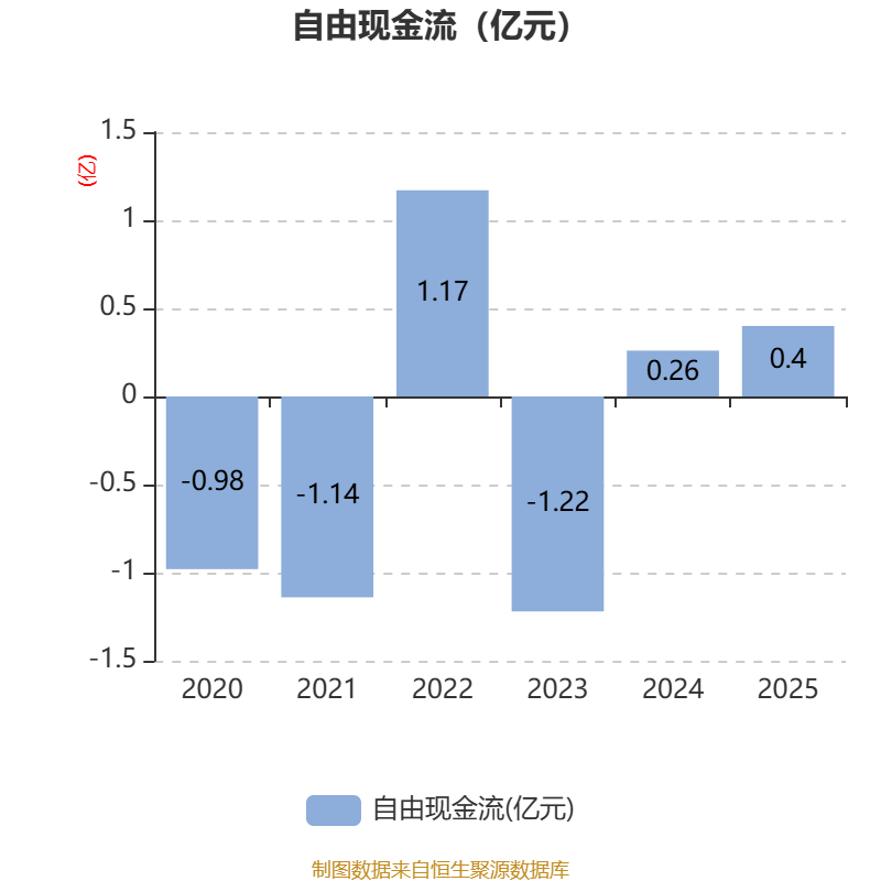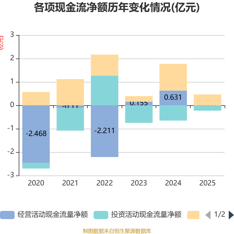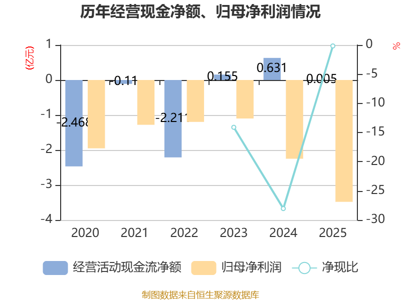 截至2025年,公司经营活动现金流净额为54.27万元,同比下降99.14%;筹资活动现金流净额4604.34万元,同比减少6826.61万元;投资活动现金流净额-2284.95万元,上年同期为-6530.81万元。