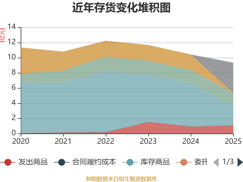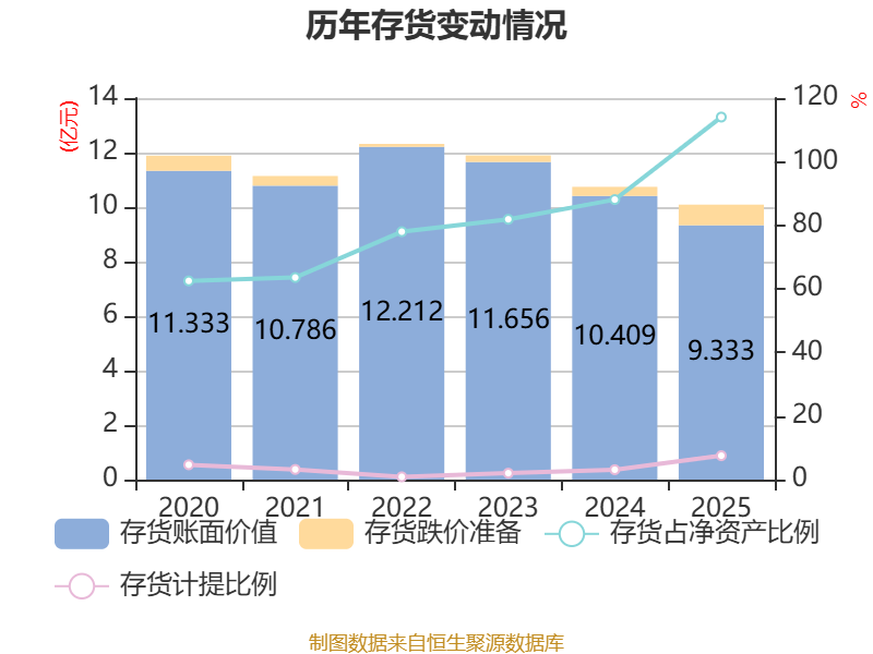 从存货变动来看,截至2025年末,公司存货账面价值为9.33亿元,占净资产的114.03%,较上年末减少1.08亿元。其中,存货跌价准备为7584.22万元,计提比例为7.52%。
