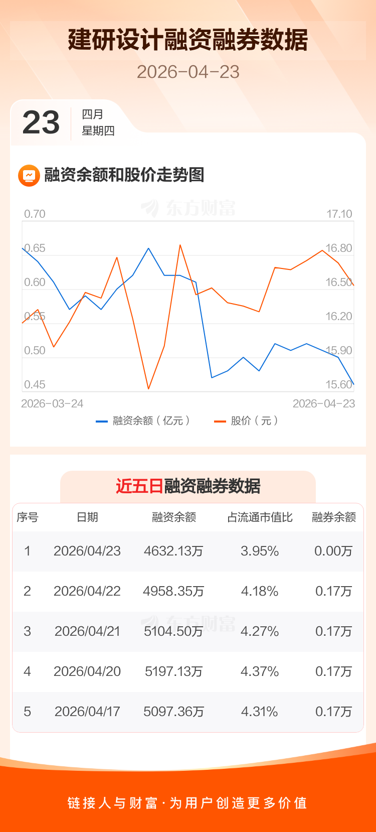 交易所最新数据显示,建研设计于2026年4月23日获融资买入329.84万元,融资偿还656.06万元,当日融资净偿还326.22万元。目前,该股融资余额4632.13万,占流通市值比例为3.95%。