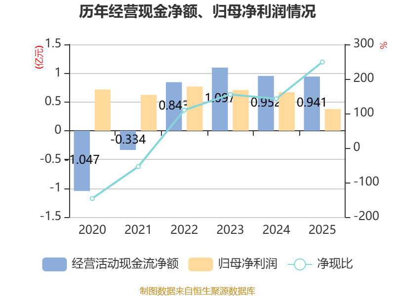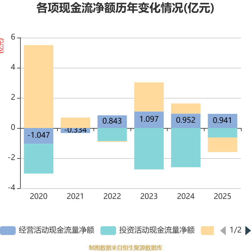 截至2025年,公司经营活动现金流净额为9406.62万元,同比下降1.17%;筹资活动现金流净额-9673.27万元,同比减少1.65亿元;投资活动现金流净额-6264.3万元,上年同期为-2.6亿元。