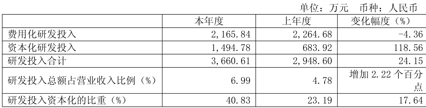 2025年全年,公司研发投入金额为3660.61万元,同比增长24.15%;研发投入占营业收入比例为6.99%,相比上年同期上升2.21个百分点。此外,公司全年研发投入资本化率为40.83%。