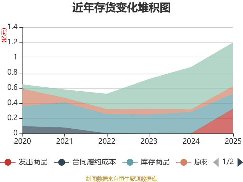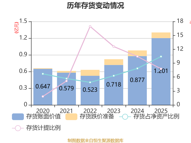 从存货变动来看,截至2025年末,公司存货账面价值为1.2亿元,占净资产的10.43%,较上年末增加3243.95万元。其中,存货跌价准备为1013.16万元,计提比例为7.78%。