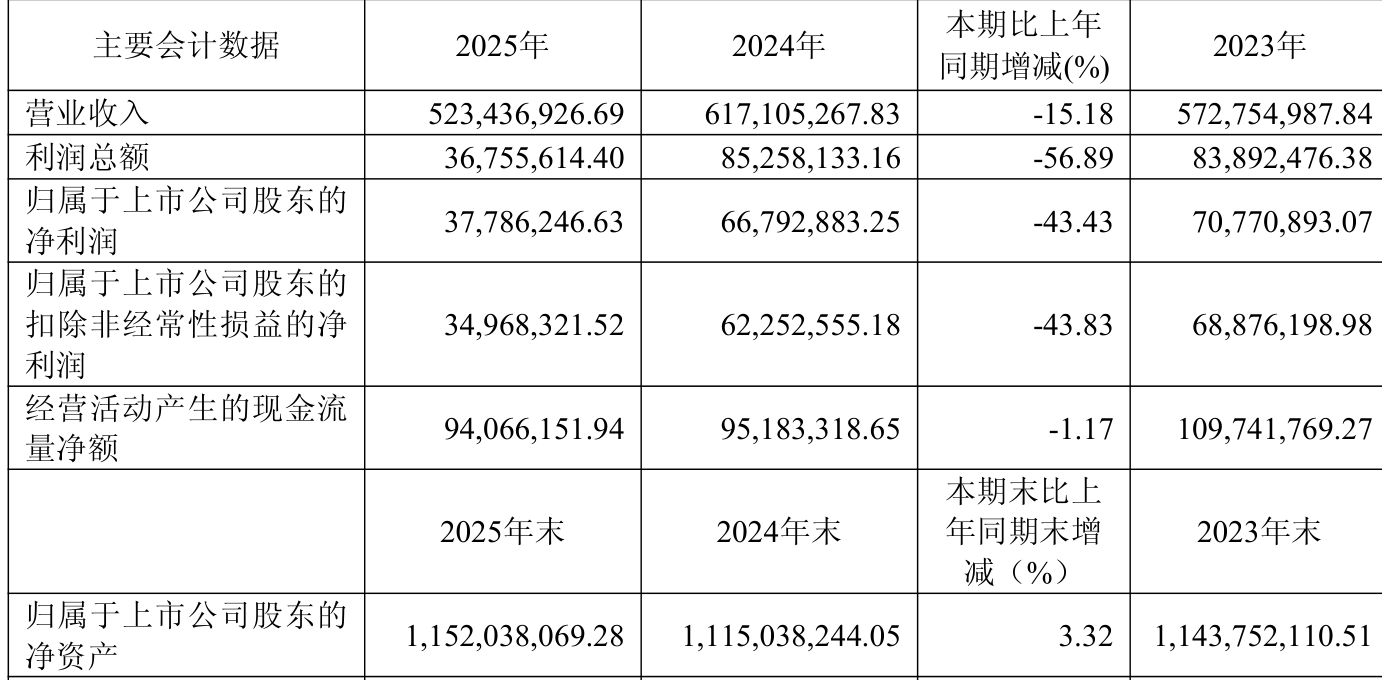 中证智能财讯金科环境(688466)4月24日披露2025年年度报告。2025年,公司实现营业总收入5.23亿元,同比下降15.18%;归母净利润3778.62万元,同比下降43.43%;扣非净利润3496.83万元,同比下降43.83%;经营活动产生的现金流量净额为9406.62万元,同比下降1.17%;报告期内,金科环境基本每股收益为0.31元,加权平均净资产收益率为3.33%。公司2025年度分配预案为:拟向全体股东每10股派现2.87元(含税)。