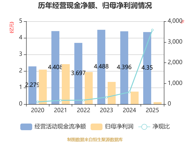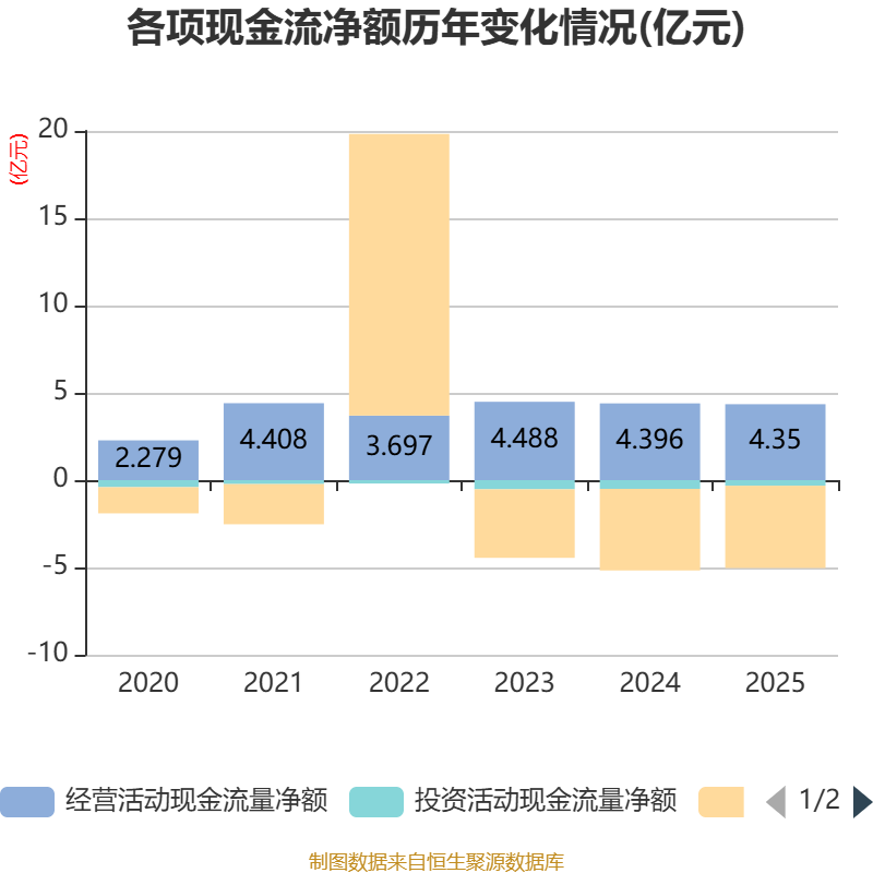 截至2025年,公司经营活动现金流净额为4.35亿元,同比下降1.05%;筹资活动现金流净额-4.71亿元,同比减少407.98万元;投资活动现金流净额-3202.62万元,上年同期为-4987万元。