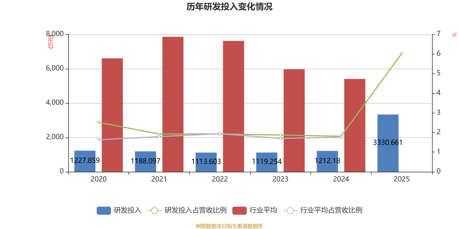 2025年全年,公司研发投入金额为3330.66万元,同比增长174.77%;研发投入占营业收入比例为6.02%,相比上年同期上升4.21个百分点。此外,公司全年研发投入资本化率为0%。