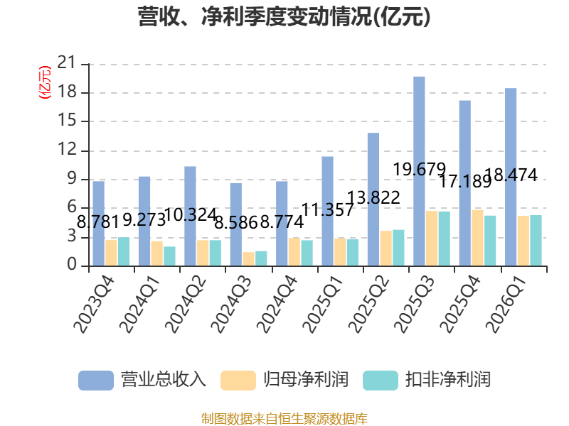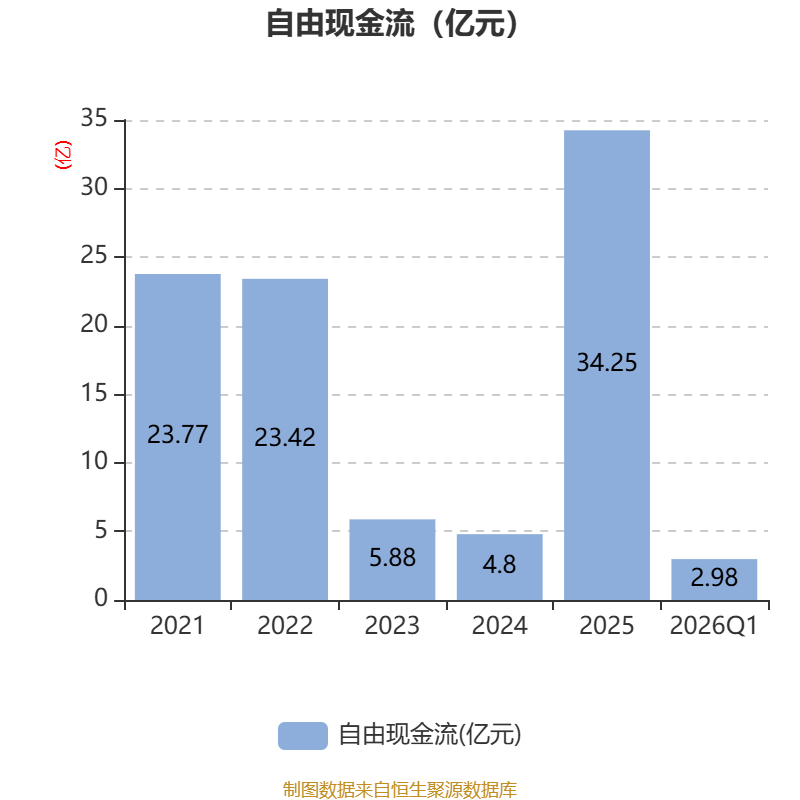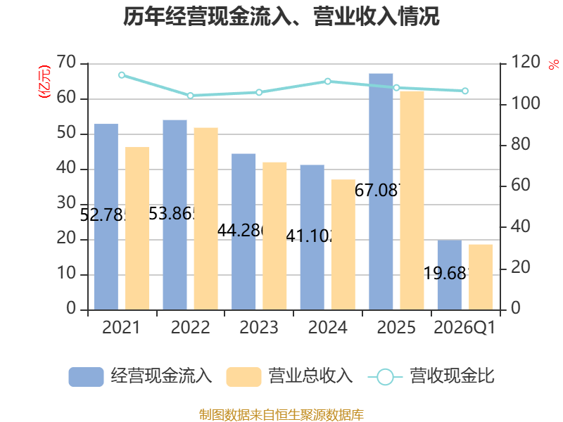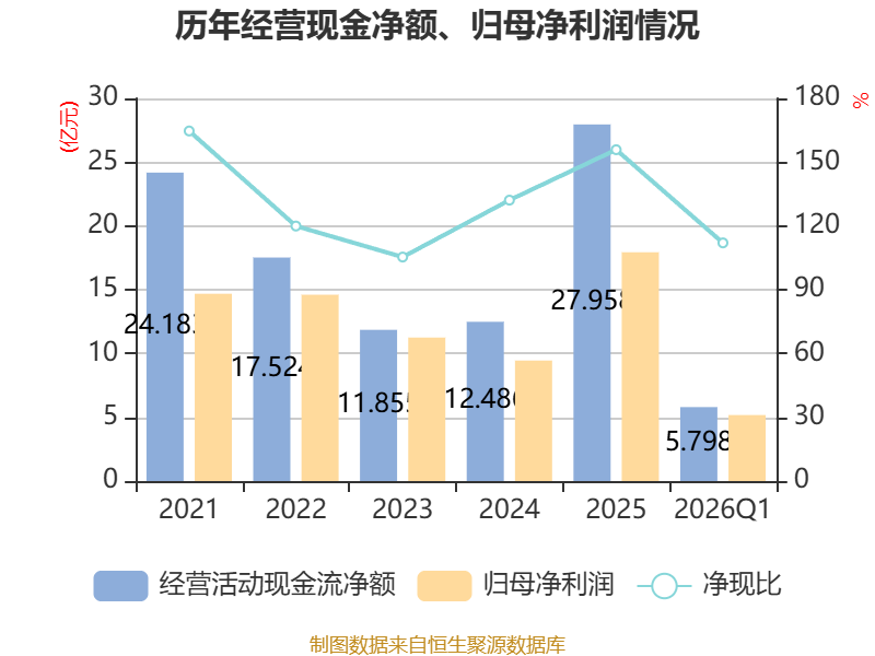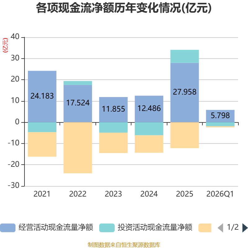 截至2026年一季度末,公司经营活动现金流净额为5.8亿元,同比增长172.53%;筹资活动现金流净额-5576.94万元,同比减少5372.04万元;投资活动现金流净额-1.88亿元,上年同期为3.54亿元。