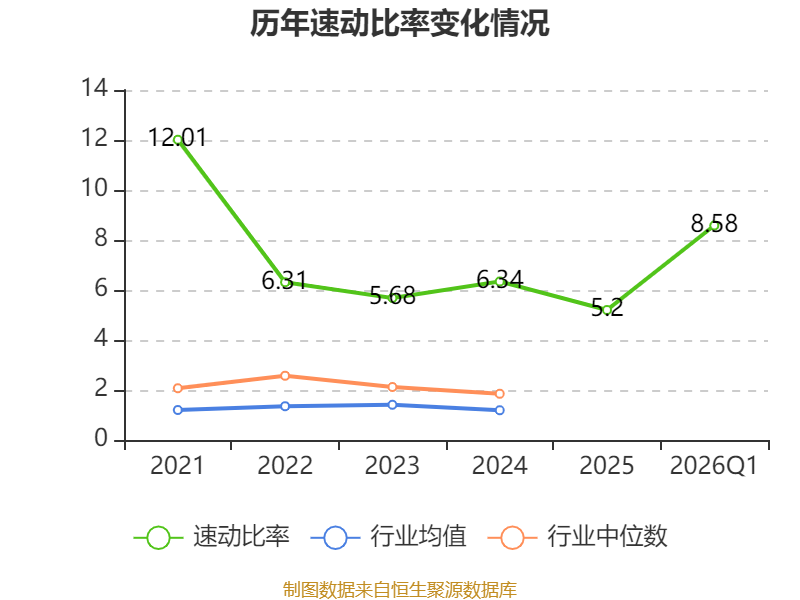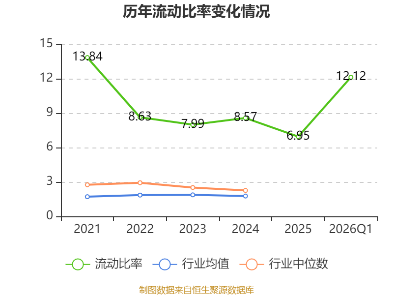 2026年第一季度,公司流动比率为12.12,速动比率为8.58。