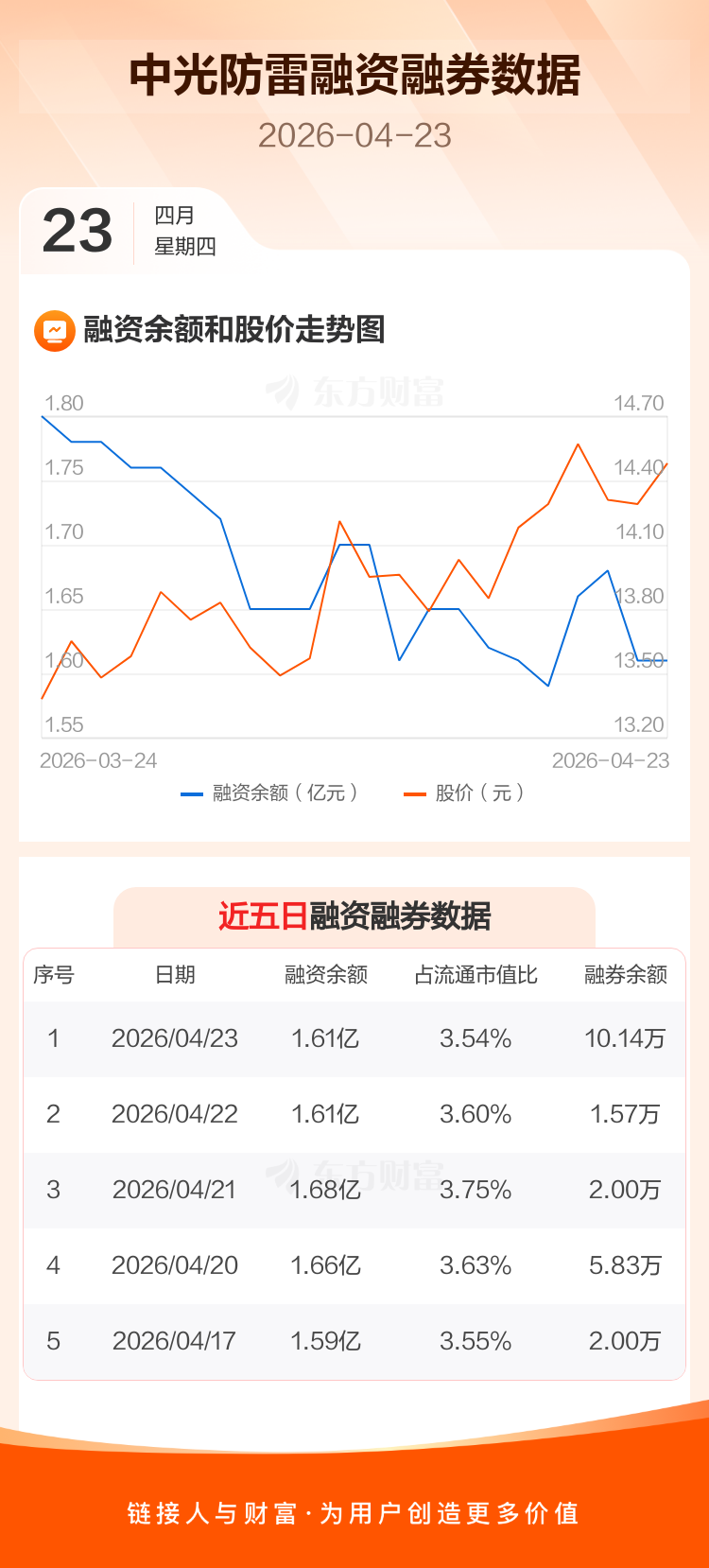 交易所最新数据显示,中光防雷于2026年4月23日获融资买入1793.99万元,融资偿还1822.90万元,当日融资净偿还28.91万元。目前,该股融资余额1.61亿,占流通市值比例为3.54%。
