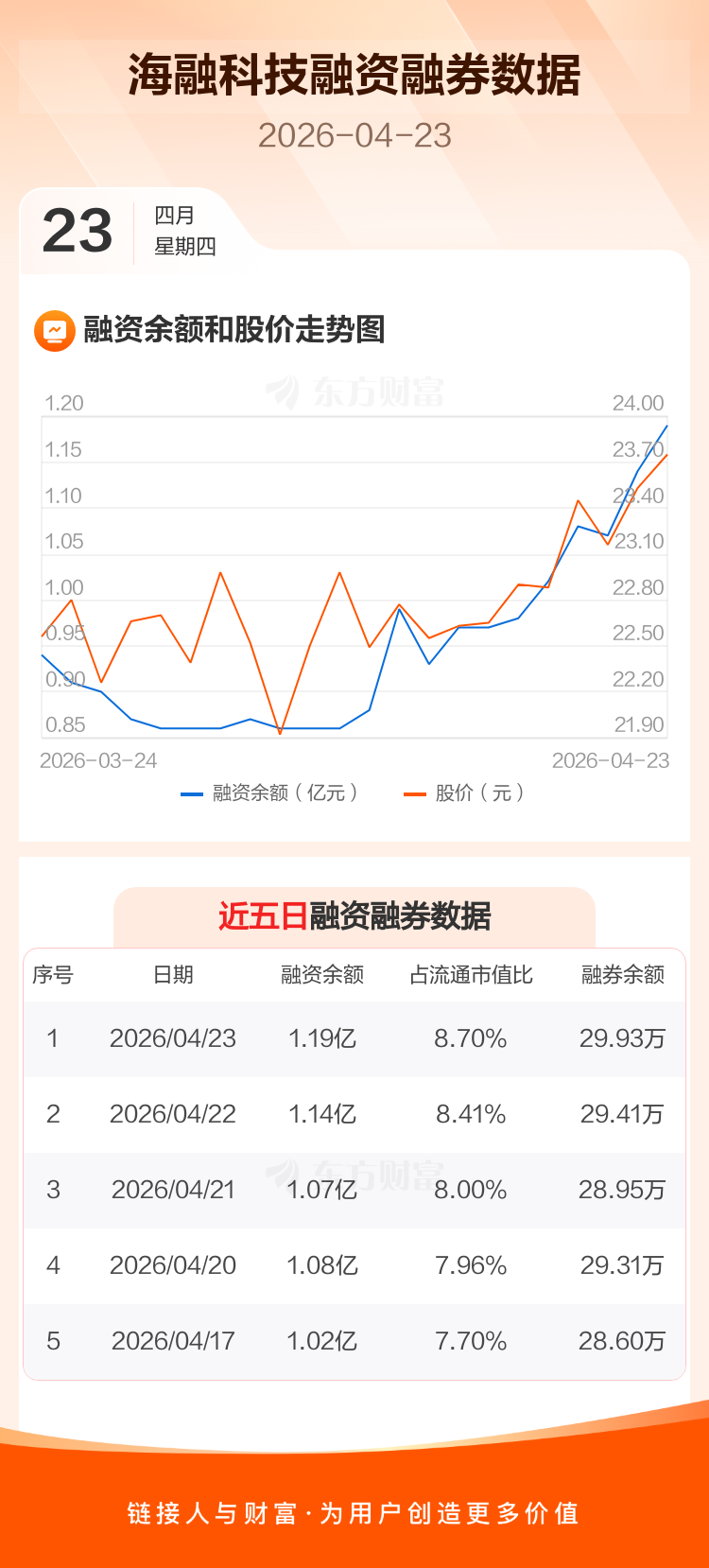 交易所最新数据显示,海融科技于2026年4月23日获融资买入1160.77万元,融资偿还650.78万元,当日融资净买入509.99万元。目前,该股融资余额1.19亿,占流通市值比例为8.70%。
