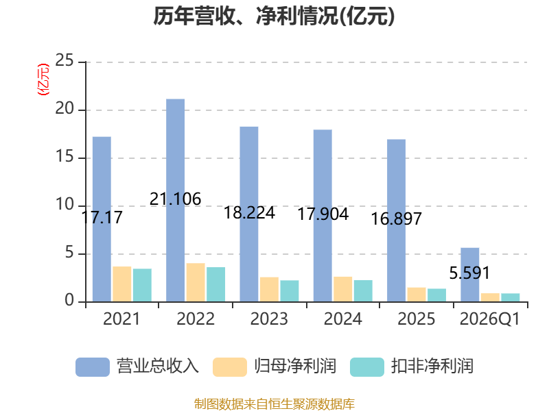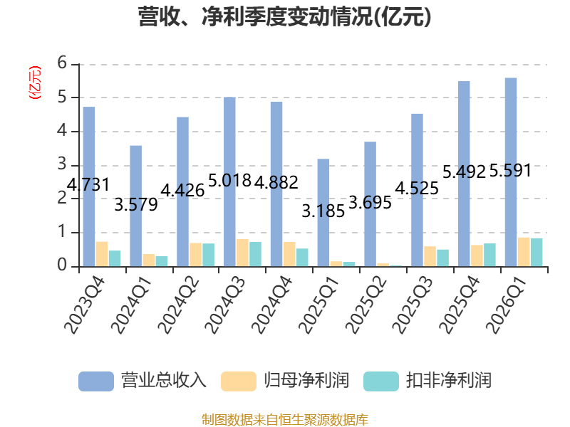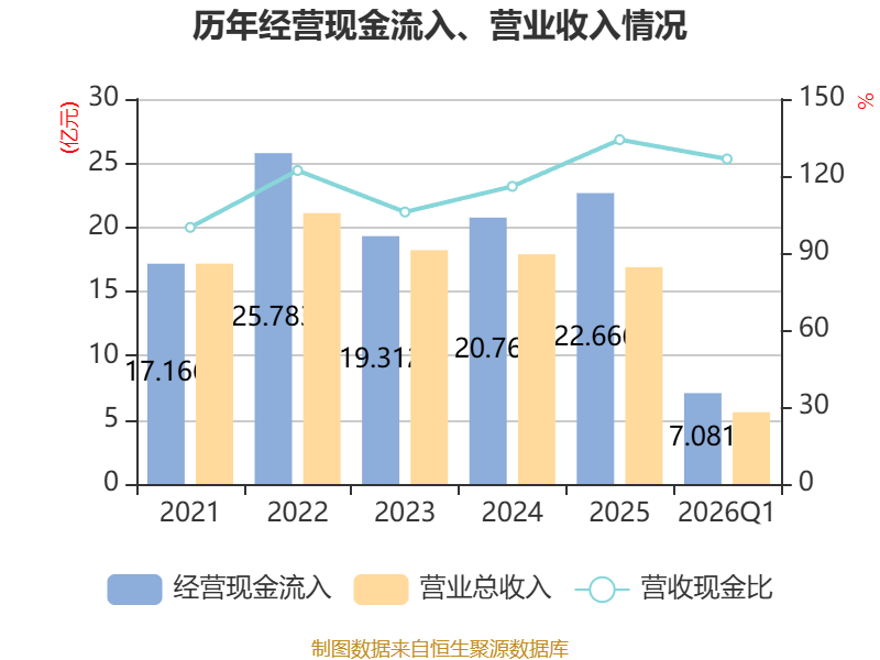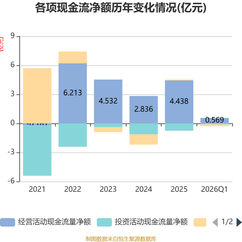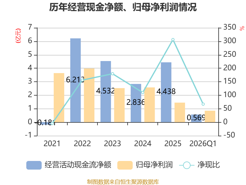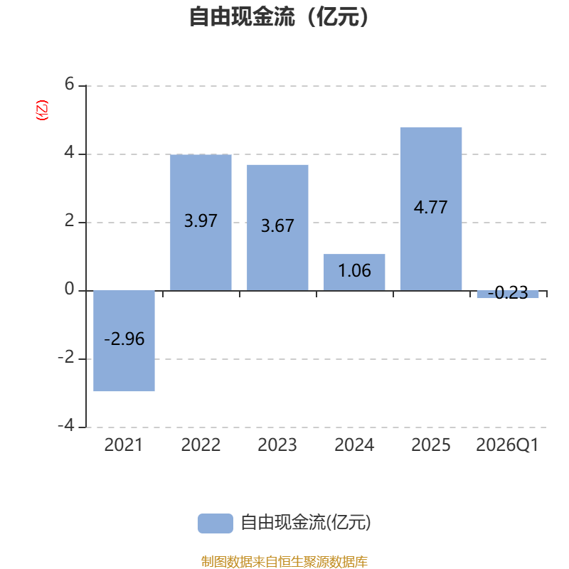 截至2026年一季度末,公司经营活动现金流净额为5687.87万元,同比下降47.12%;筹资活动现金流净额-1975.71万元,同比减少8067.97万元;投资活动现金流净额-881.02万元,上年同期为-4364.49万元。
