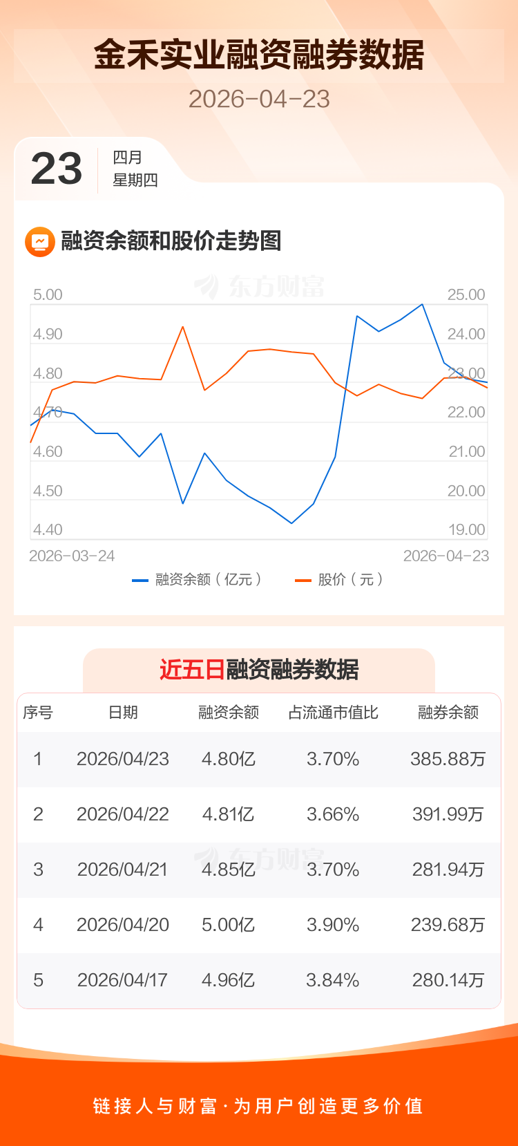 交易所最新数据显示,金禾实业于2026年4月23日获融资买入1064.04万元,融资偿还1151.81万元,当日融资净偿还87.76万元。目前,该股融资余额4.80亿,占流通市值比例为3.70%。