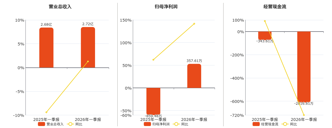 公司营业总收入为2.72亿元。归母净利润为357.61万元。经营活动现金净流入为-2816.61万元,较去年同报告期经营活动现金净流入减少2473.01万元。
