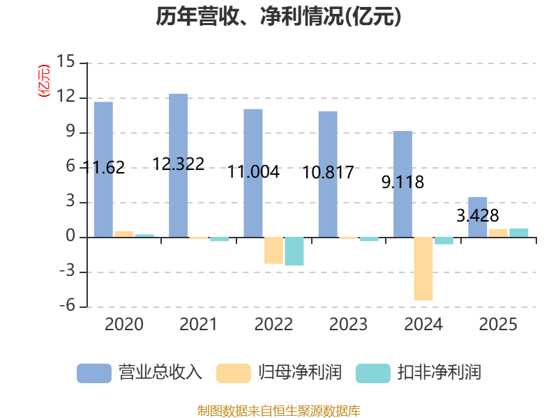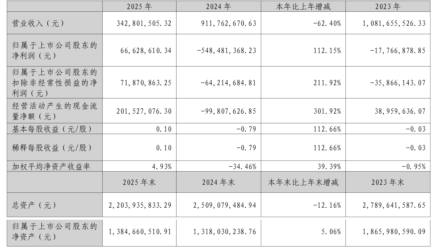 中证智能财讯美利云(000815)4月24日披露2025年年度报告。2025年,公司实现营业总收入3.43亿元,同比下降62.40%;归母净利润6662.86万元,同比扭亏;扣非净利润7187.09万元,同比扭亏;经营活动产生的现金流量净额为2.02亿元,上年同期为-9980.76万元;报告期内,美利云基本每股收益为1.10元,加权平均净资产收益率为4.93%。