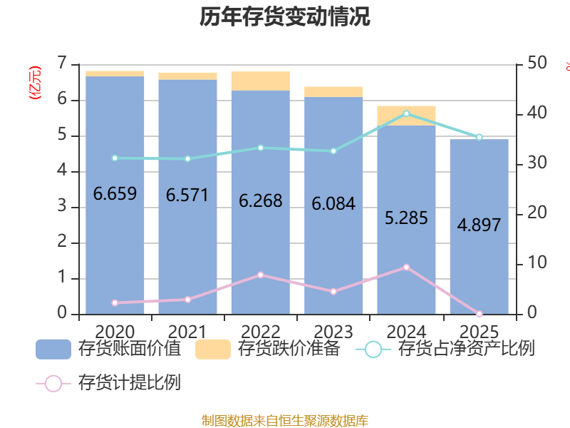 从存货变动来看,截至2025年末,公司存货账面价值为4.9亿元,占净资产的35.36%,较上年末减少3887万元。公司本期没有计提存货跌价准备。