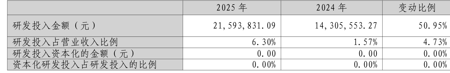 2025年全年,公司研发投入金额为2159.38万元,同比增长50.95%;研发投入占营业收入比例为6.3%,相比上年同期上升4.73个百分点。此外,公司全年研发投入资本化率为0%。