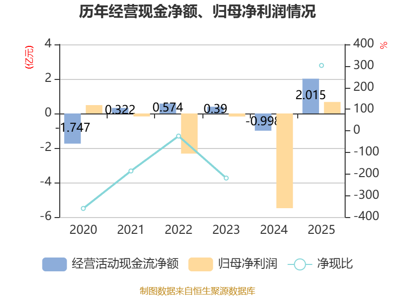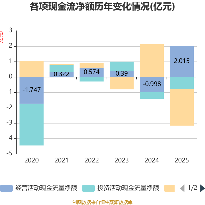 截至2025年,公司经营活动现金流净额为2.02亿元,同比增加3.01亿元;筹资活动现金流净额-2.37亿元,同比减少4.5亿元;投资活动现金流净额-8007.43万元,上年同期为-4270.25万元。