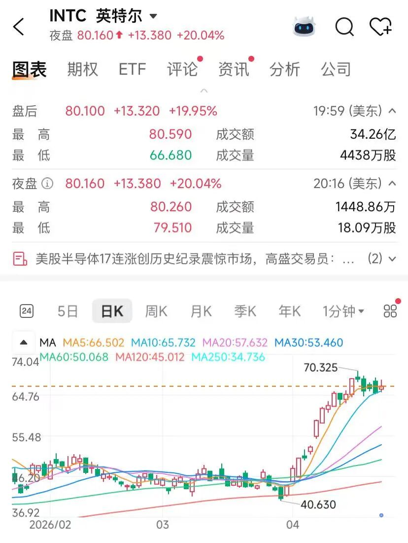 焦点个股中,英特尔当地时间周四盘后公布2026年第一季度业绩,营收、毛利率与每股收益均超出指引上限,成为该公司连续第六个季度超越财务预期。盘后交易时段,英特尔股价大涨近20%,股价再创历史新高。