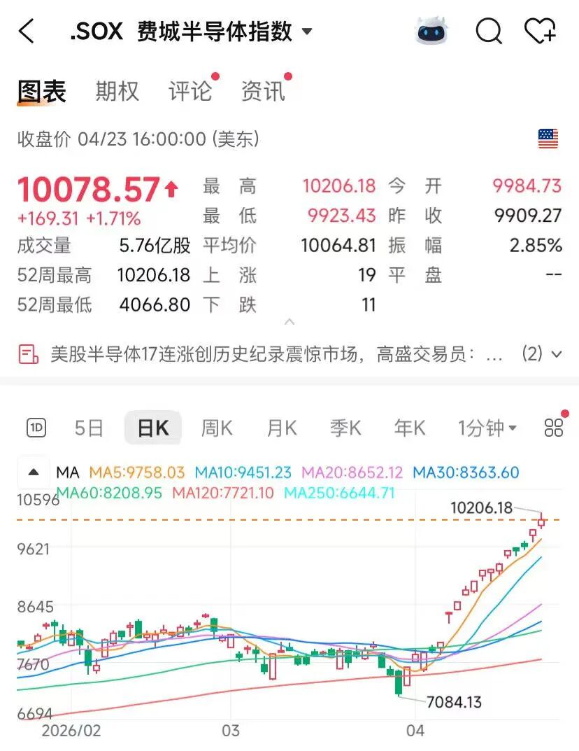 费城半导体指数连续第十七个交易日收涨