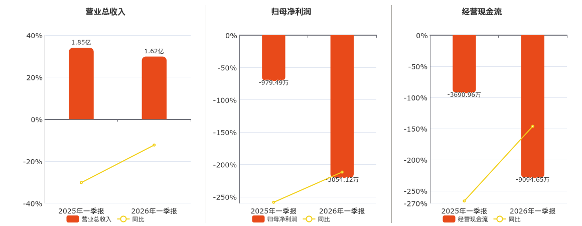 公司营业总收入为1.62亿元,较去年同报告期营业总收入减少2277.67万元,同比较去年同期下降12.30%。归母净利润为-3054.12万元,较去年同报告期归母净利润减少2074.63万元。经营活动现金净流入为-9094.65万元,较去年同报告期经营活动现金净流入减少5403.69万元。