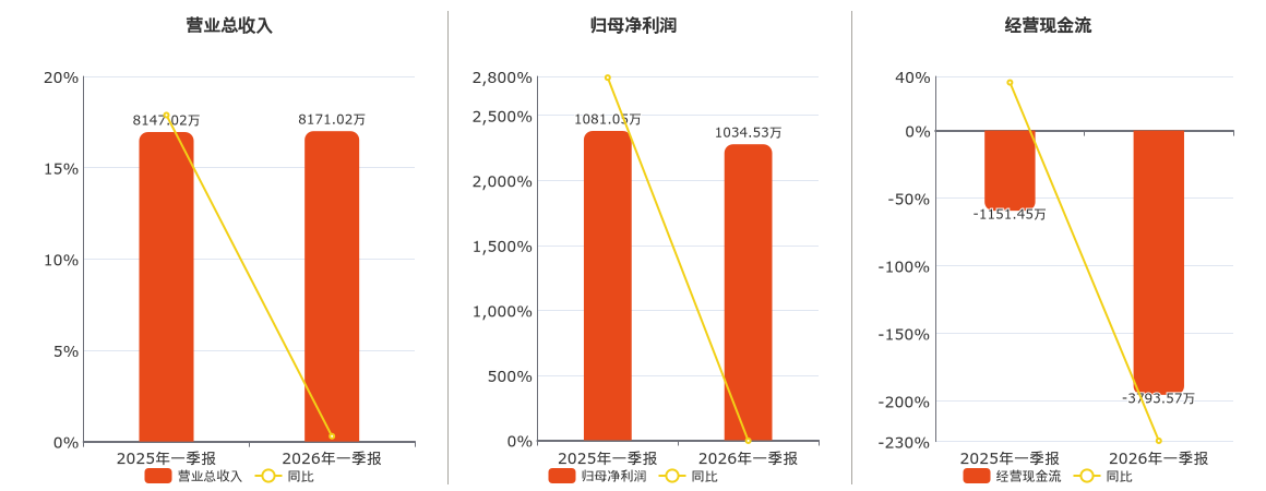 公司营业总收入为8171.02万元,较去年同报告期营业总收入增加24.00万元,实现2年连续上涨,同比较去年同期上涨0.29%。归母净利润为1034.53万元,较去年同报告期归母净利润减少46.53万元,同比较去年同期下降4.30%。经营活动现金净流入为-3793.57万元,较去年同报告期经营活动现金净流入减少2642.12万元。