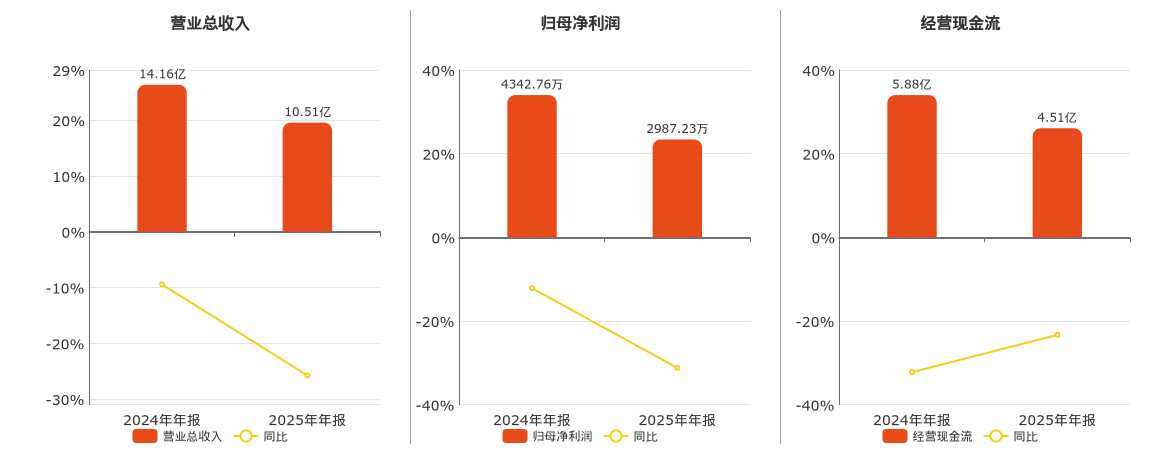 公司营业总收入为10.51亿元,在已披露的同业公司中排名第4,较去年同报告期营业总收入减少3.65亿元,同比较去年同期下降25.76%。归母净利润为2987.23万元,在已披露的同业公司中排名第3,较去年同报告期归母净利润减少1355.52万元,同比较去年同期下降31.21%。经营活动现金净流入为4.51亿元,较去年同报告期经营活动现金净流入减少1.37亿元,同比较去年同期下降23.33%。