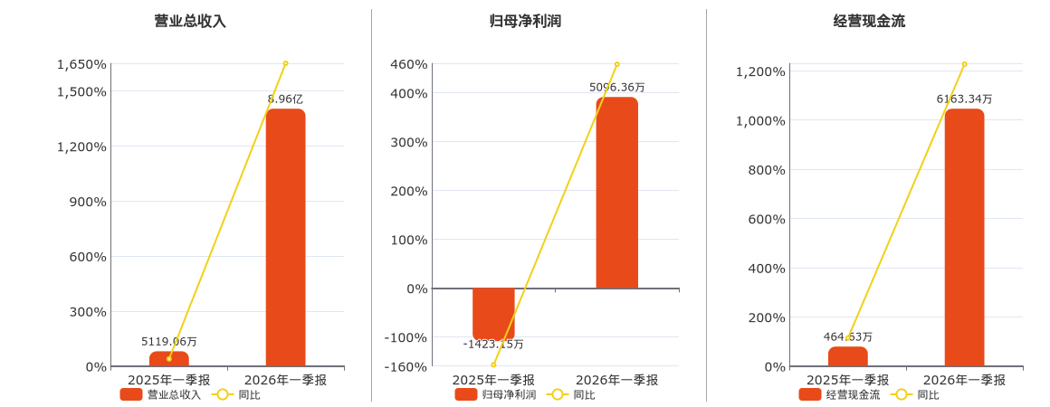 公司营业总收入为8.96亿元,较去年同报告期营业总收入增加8.45亿元,实现4年连续上涨,同比较去年同期上涨1649.93%。归母净利润为5096.36万元,较去年同报告期归母净利润增加6519.51万元。经营活动现金净流入为6163.34万元,较去年同报告期经营活动现金净流入增加5698.71万元,实现2年连续上涨,同比较去年同期上涨1226.50%。