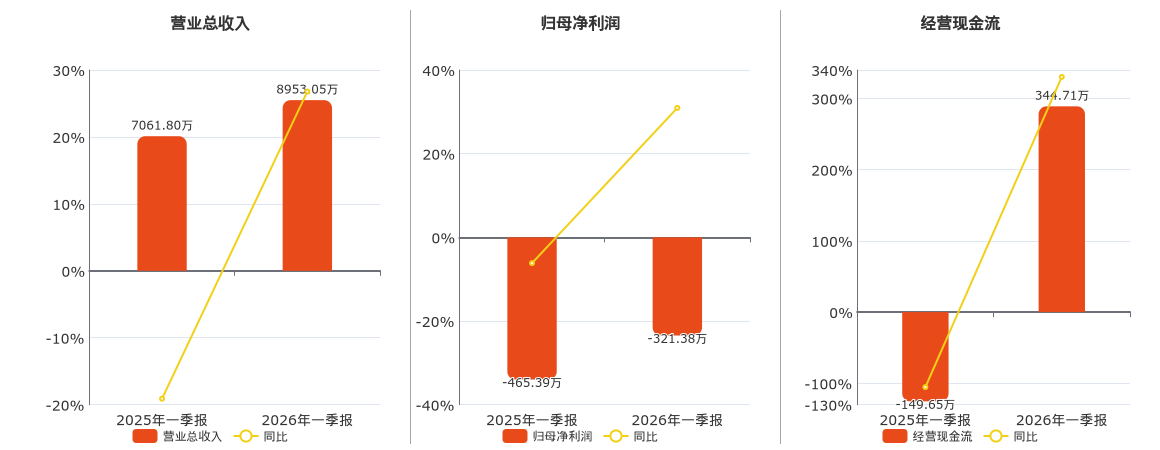 公司营业总收入为8953.05万元。归母净利润为-321.38万元。经营活动现金净流入为344.71万元。