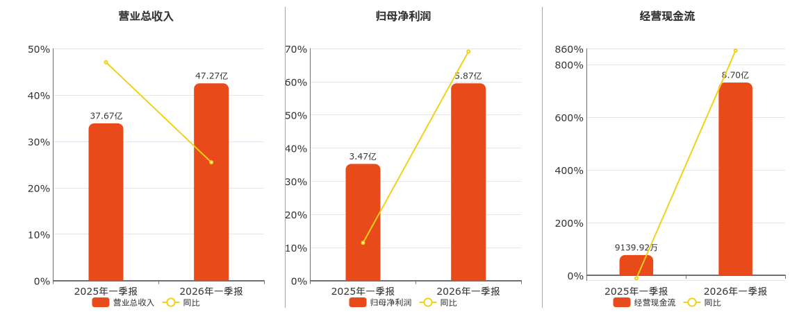 公司营业总收入为47.27亿元。归母净利润为5.87亿元。经营活动现金净流入为8.70亿元。