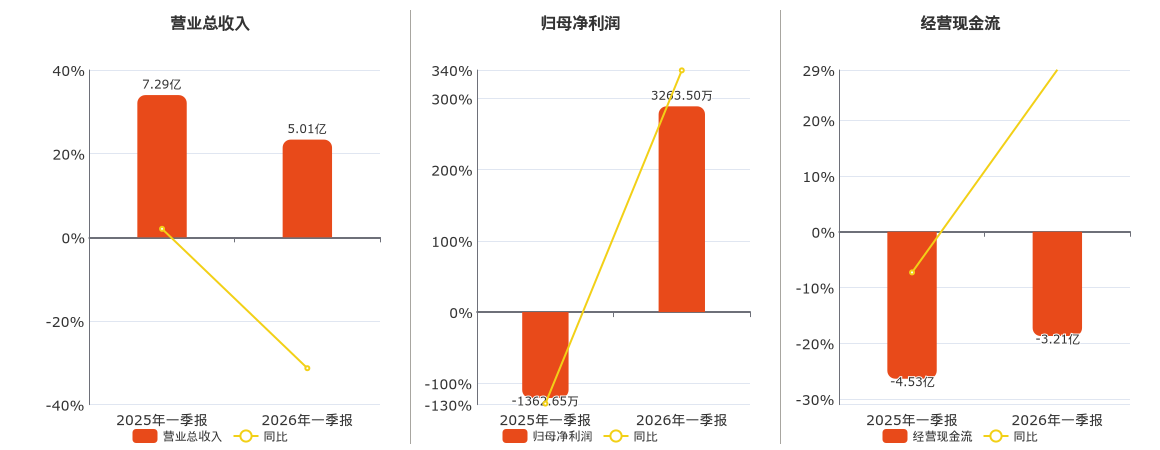 公司营业总收入为5.01亿元,较去年同报告期营业总收入减少2.28亿元,同比较去年同期下降31.29%。归母净利润为3263.50万元。经营活动现金净流入为-3.21亿元。
