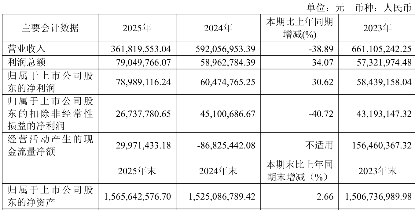 中证智能财讯创耀科技(688259)4月24日披露2025年年度报告。2025年,公司实现营业总收入3.62亿元,同比下降38.89%;归母净利润7898.91万元,同比增长30.62%;扣非净利润2673.78万元,同比下降40.72%;经营活动产生的现金流量净额为2997.14万元,上年同期为-8682.54万元;报告期内,创耀科技基本每股收益为0.71元,加权平均净资产收益率为5.10%。公司2025年度分配预案为:拟向全体股东每10股派现0.5元(含税)。