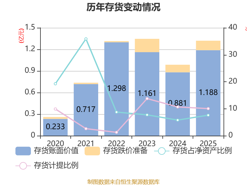 从存货变动来看,截至2025年末,公司存货账面价值为1.19亿元,占净资产的7.59%,较上年末增加3077.04万元。其中,存货跌价准备为1324.92万元,计提比例为10.03%。
