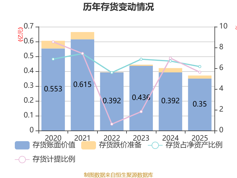 从存货变动来看,截至2025年末,公司存货账面价值为3502.76万元,占净资产的6.16%,较上年末减少420.22万元。其中,存货跌价准备为208.51万元,计提比例为5.62%。