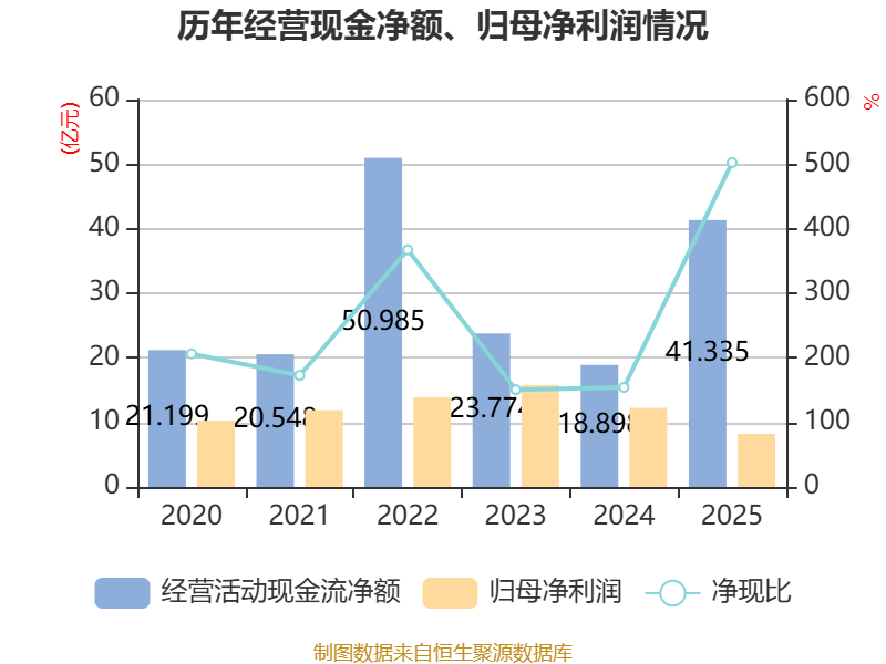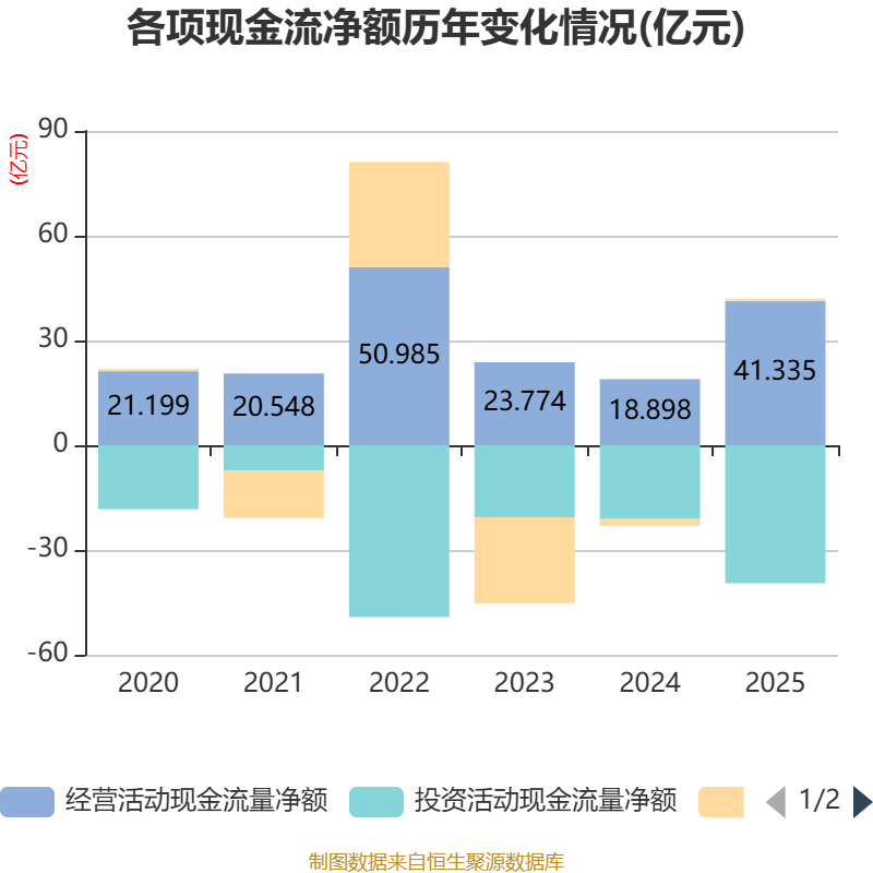 截至2025年,公司经营活动现金流净额为41.33亿元,同比增长118.72%;筹资活动现金流净额6588.28万元,同比增加2.62亿元;投资活动现金流净额-39.51亿元,上年同期为-21.12亿元。