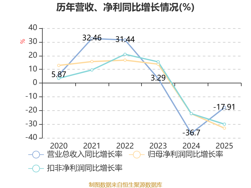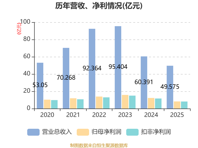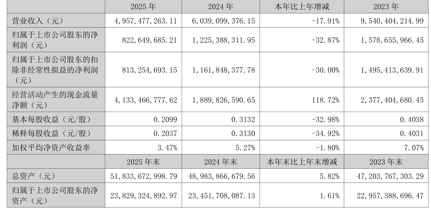 中证智能财讯太阳能(000591)4月24日披露2025年年度报告。2025年,公司实现营业总收入49.57亿元,同比下降17.91%;归母净利润8.23亿元,同比下降32.87%;扣非净利润8.13亿元,同比下降30.00%;经营活动产生的现金流量净额为41.33亿元,同比增长118.72%;报告期内,太阳能基本每股收益为0.2099元,加权平均净资产收益率为3.47%。公司2025年度分配预案为:拟向全体股东每10股派现0.13元(含税)。