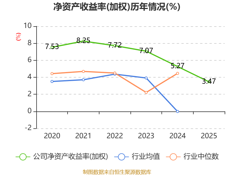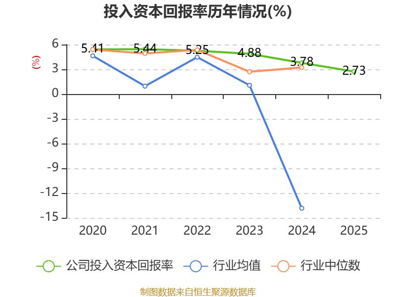数据显示,2025年公司加权平均净资产收益率为3.47%,较上年同期下降1.8个百分点。公司2025年投入资本回报率为2.73%,较上年同期下降1.05个百分点。
