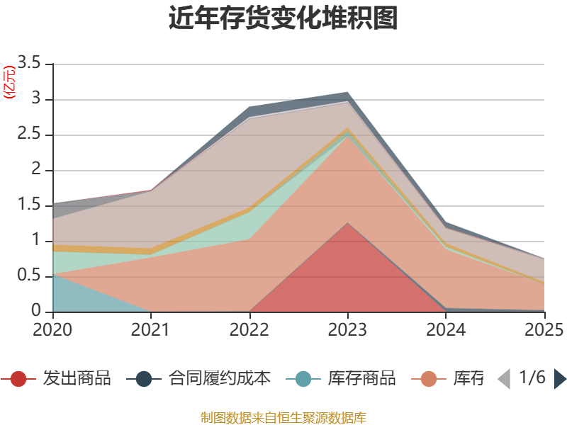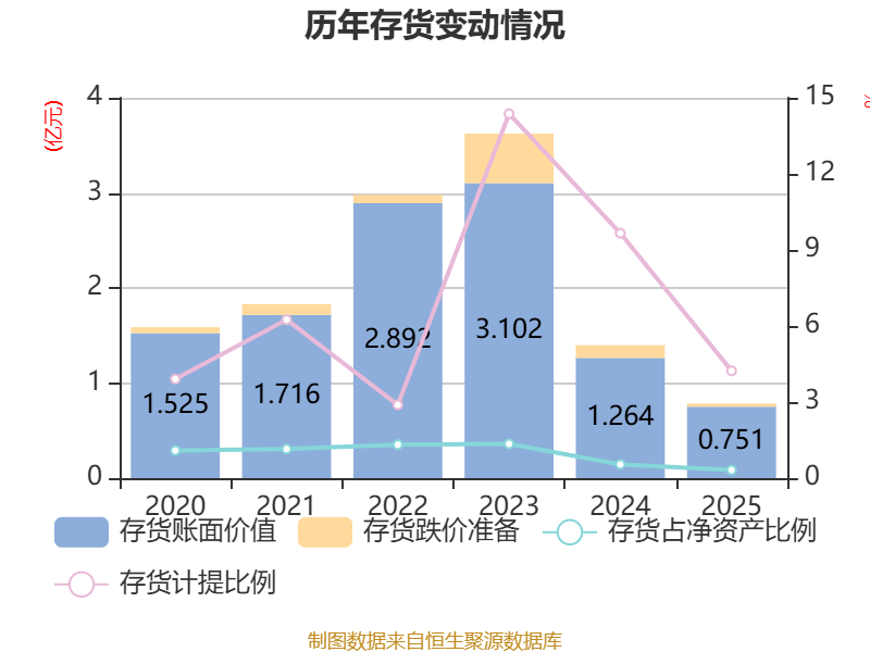 从存货变动来看,截至2025年末,公司存货账面价值为7512.34万元,占净资产的0.32%,较上年末减少5132.46万元。其中,存货跌价准备为331.75万元,计提比例为4.23%。