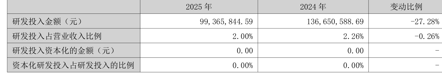 2025年全年,公司研发投入金额为9936.58万元,同比下降27.28%;研发投入占营业收入比例为2%,相比上年同期下降0.26个百分点。此外,公司全年研发投入资本化率为0%。