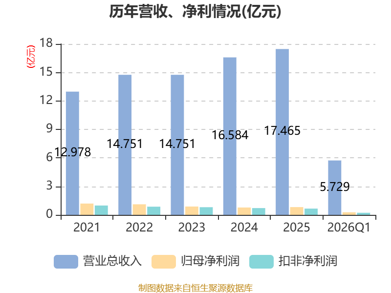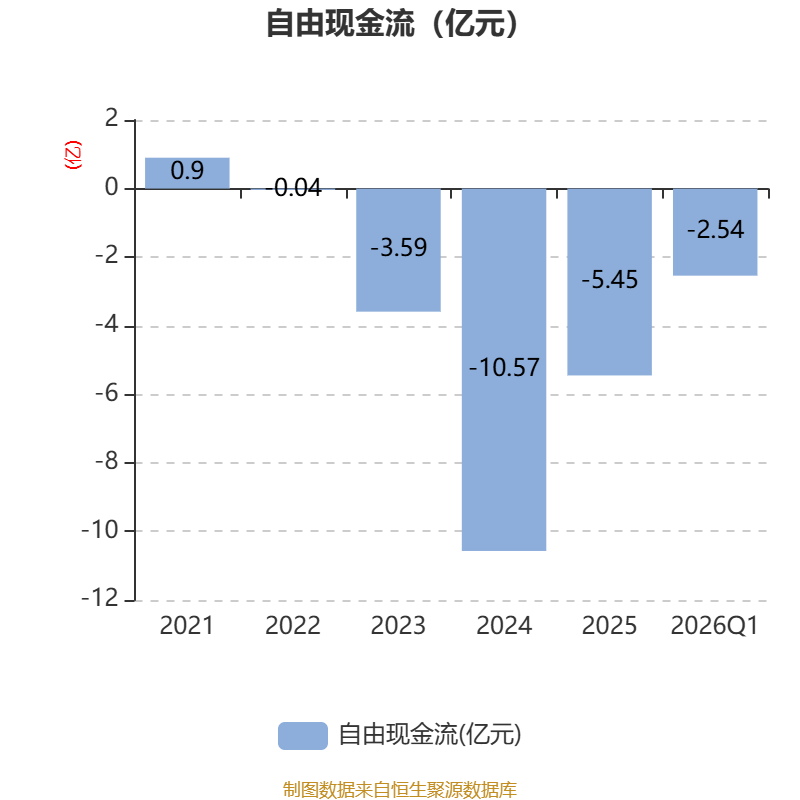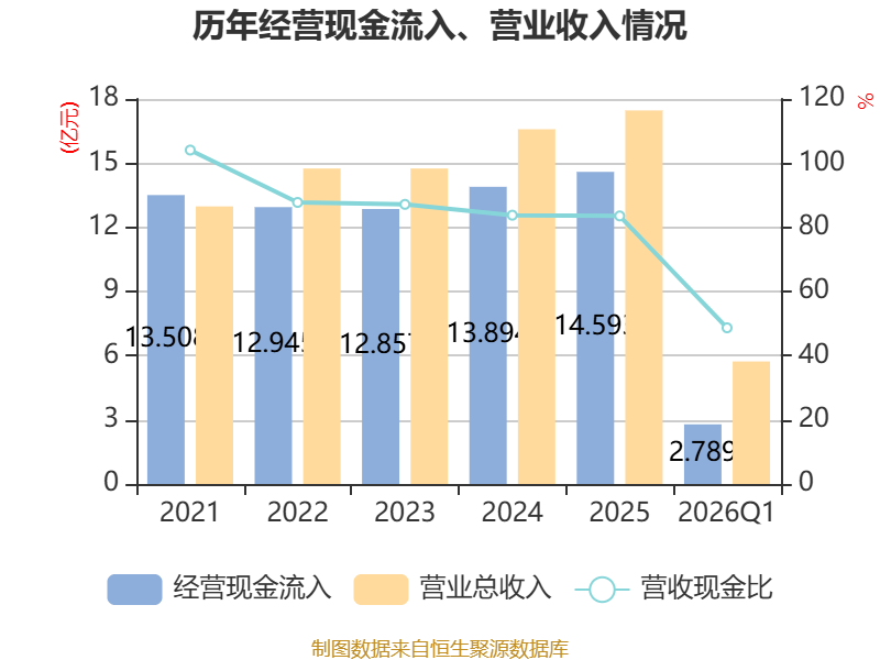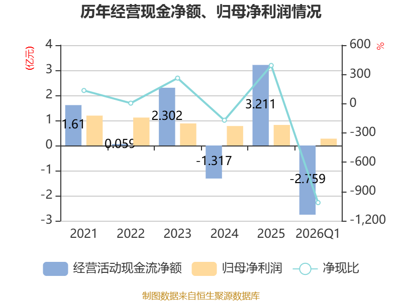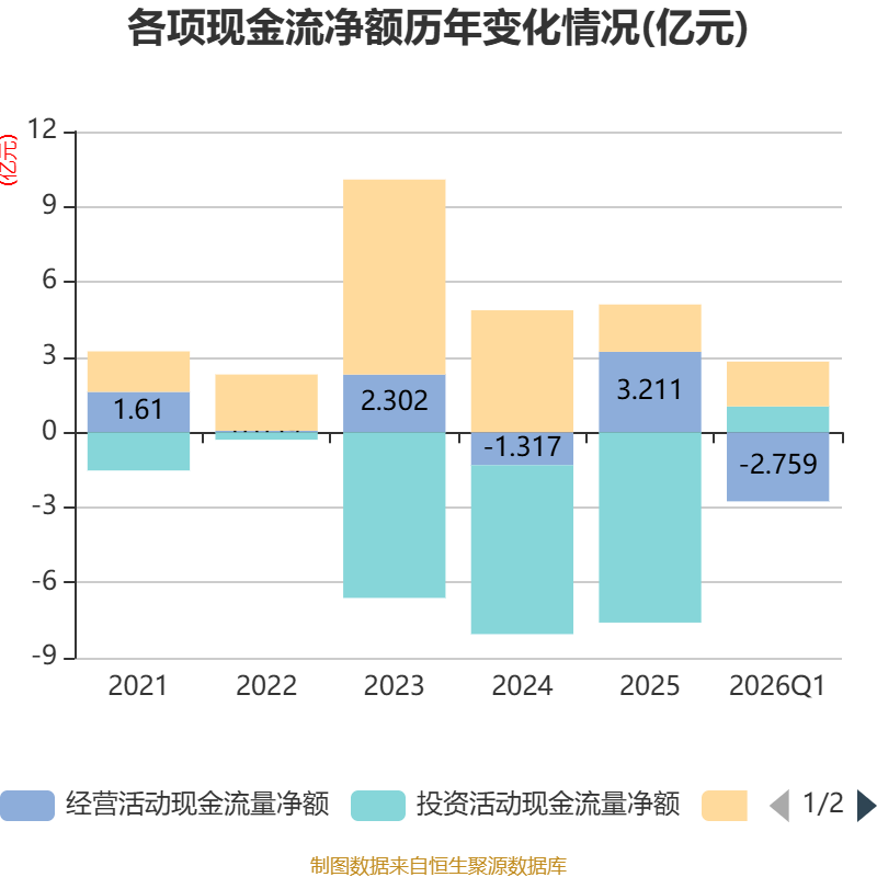 截至2026年一季度末,公司经营活动现金流净额为-2.76亿元,同比减少2.34亿元;筹资活动现金流净额1.79亿元,同比减少1.02亿元;投资活动现金流净额1.03亿元,上年同期为-5.13亿元。