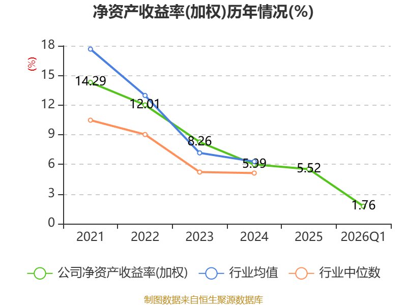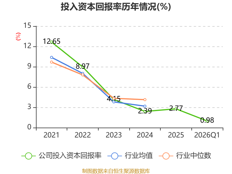 盈利能力方面, 2026年一季度公司加权平均净资产收益率为1.76%,同比上升0.4个百分点。公司2026年第一季度投入资本回报率为0.98%,较上年同期上升0.43个百分点。
