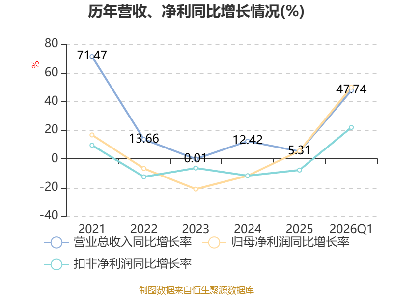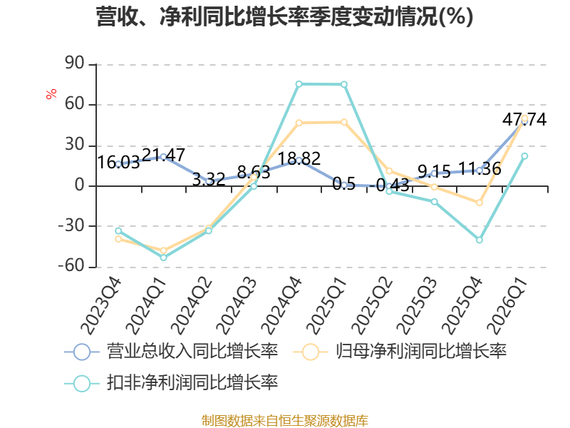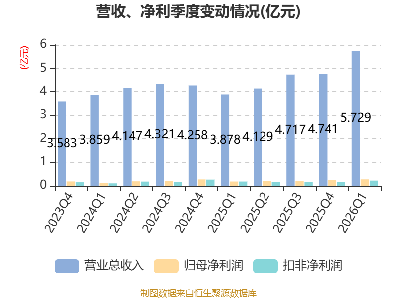 中证智能财讯美瑞新材(300848)4月24日披露2026年第一季度报告。公司实现营业总收入5.73亿元,同比增长47.74%;归母净利润2720.43万元,同比增长49.99%;扣非净利润2202.08万元,同比增长22.01%;经营活动产生的现金流量净额为-2.76亿元,上年同期为-4227.87万元;报告期内,美瑞新材基本每股收益为0.06元,加权平均净资产收益率为1.76%。